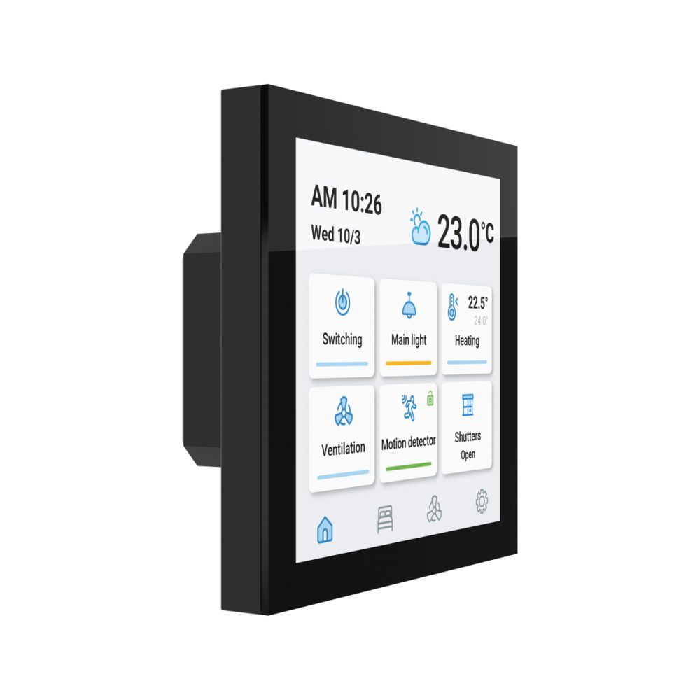- RF Touch-2 má integrované snímače teploty, vlhkosti na riadenie vykurovacích režimov.