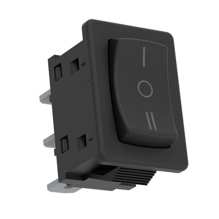 - Spínač a tlačidlo s nulovou polohou uprostred s potlačou I/0/II