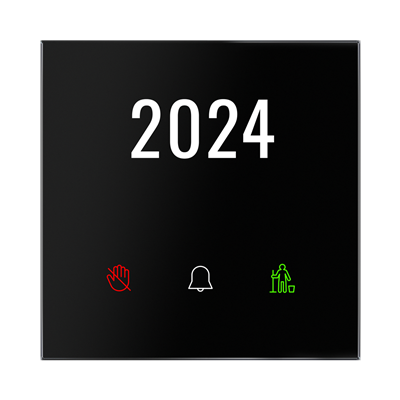 - Ovladač je také vybaven 3x kapacitním dotykovým tlačítkem s různými funkcemi nebo makrem (sadou funkcí). Díky tomu lze použít jedno tlačítko k ovládání několika prvků. Například funkce zvonku a dvě ikony, které indikují stav požadavků hosta, např. „Nerušit“ a „Uklidit pokoj“, jejichž stav může host nastavit na jiném skleněném panelu se spínači.